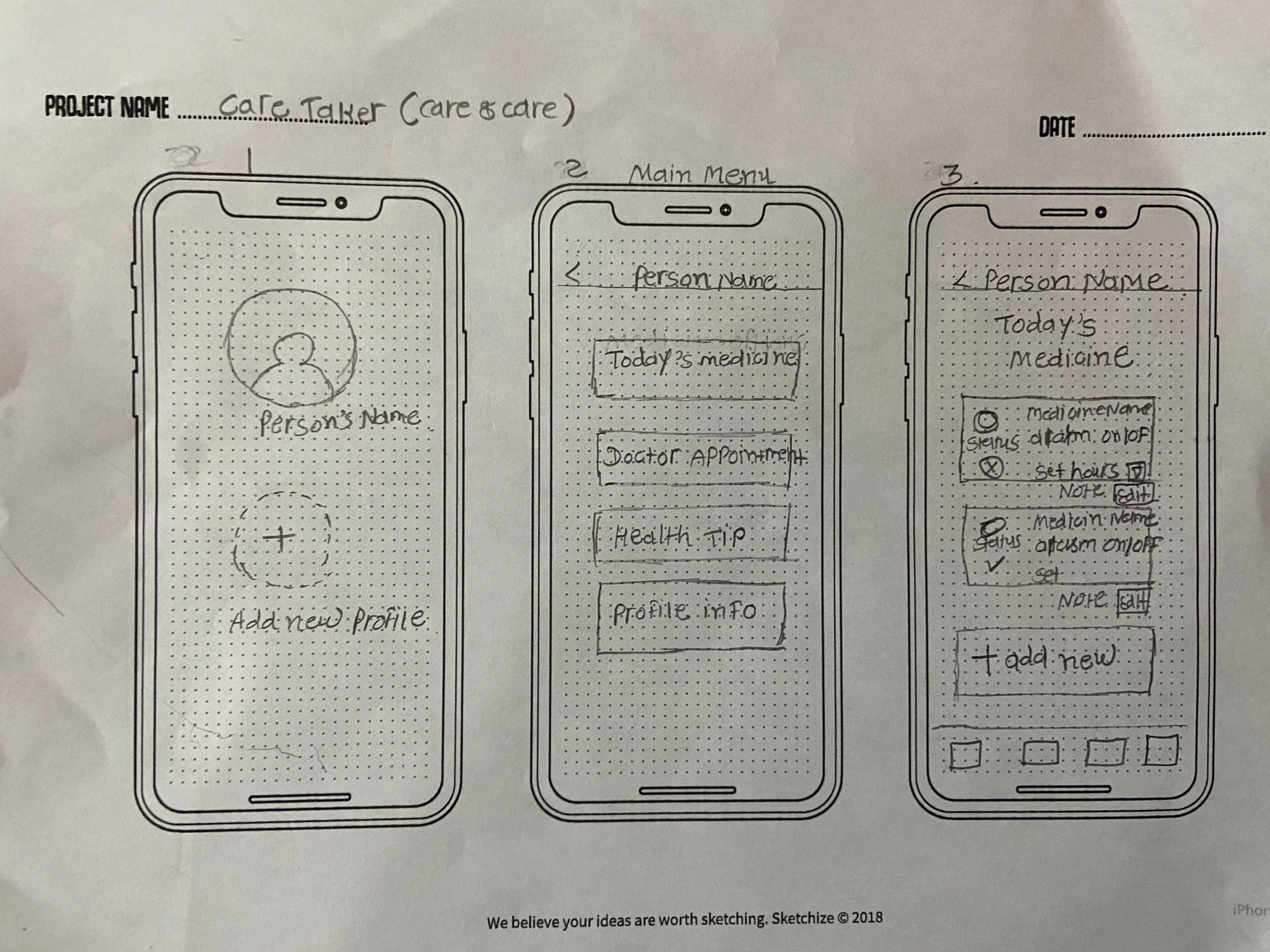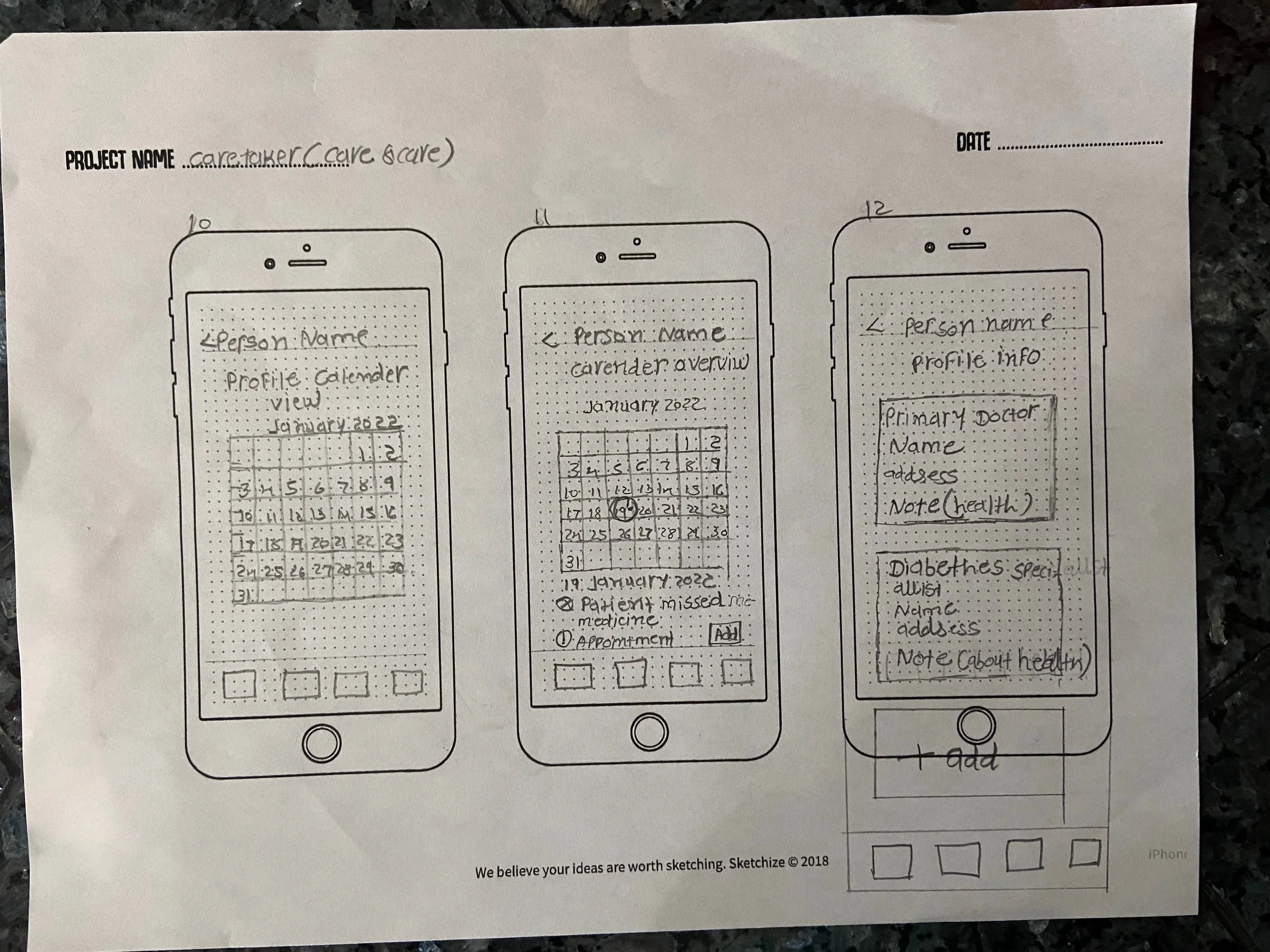 The final sketches featured screens for the daily medication reminder list and upcoming appointments or calendar entries.